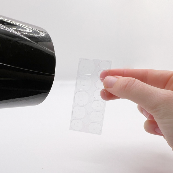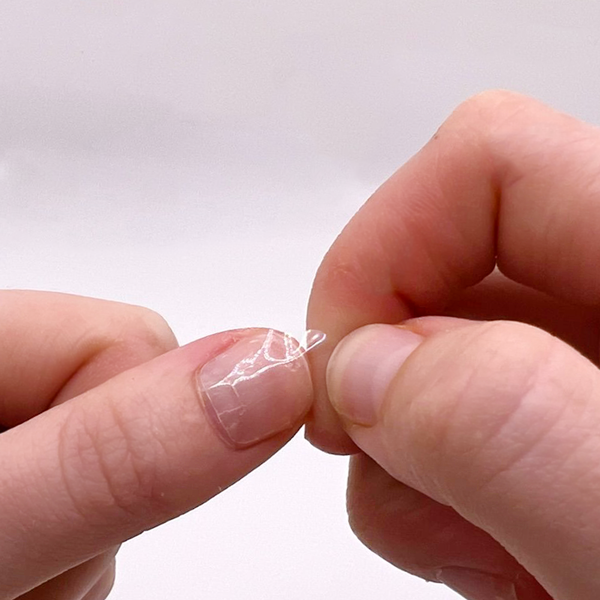 Select the sticky pad that best fits your nail size and carefully apply it onto your finger, ensuring it covers the entire nail surface. Locate the tab at the top of the pad and gently pull it backward to remove the backing.